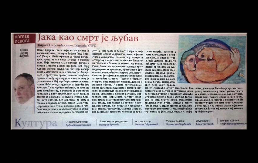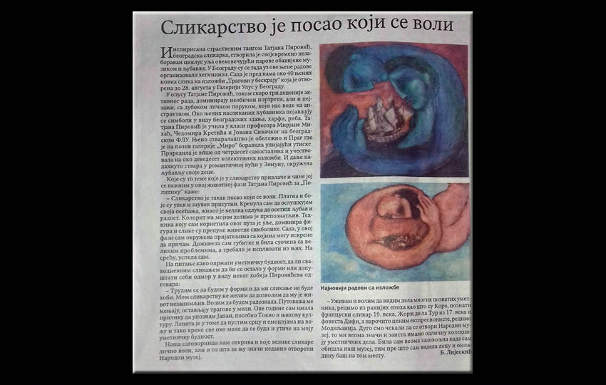 タチアナ・ピロヴィッチの絵画は、自らの芸術家としての軌跡に自ら課した新たな挑戦とともに新たな感情とモチーフを示し、そのたどる軌跡の最後には美が宿ります。